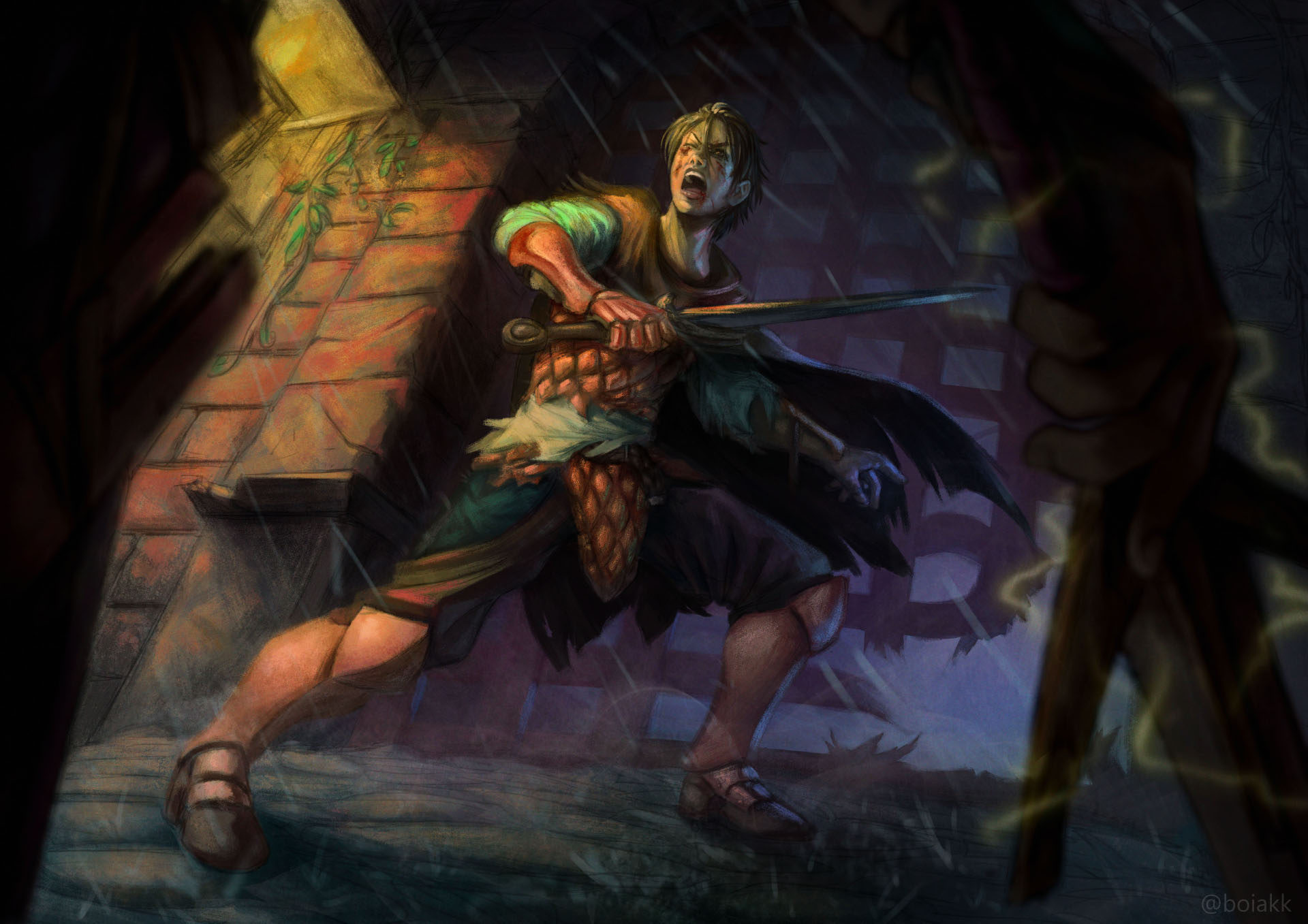 A second illustration for Arnen, he again faces the boss from the previous picture. Both of then fell by the end of it, but with incredible dice luck only Arnen survived. I thought about playing with their positions reversing the previous illustration and put Arnen on the left instead, but I felt it made him more imposing than it should. All the cards were against him, he was much weaker than the enemy in a volatile situation; feeling which we wanted to represent. Even if ever so slightly, I tried making the boss on the left a bit more imposing, his posture doesn't being as broken as Arnen's and he also had his lightning attack, but compared to the last time, this time he is visible in the frame within sword's reach. Arnen on the other hand has his clothes even more torn than the boss', the sword piercing his chest with more impact and blood gushing, his hands going limp; if someone were to bet on the winner after witnessing such fight, they'd bet on the boss to get up and survive. And yet, the lucky underdog won.