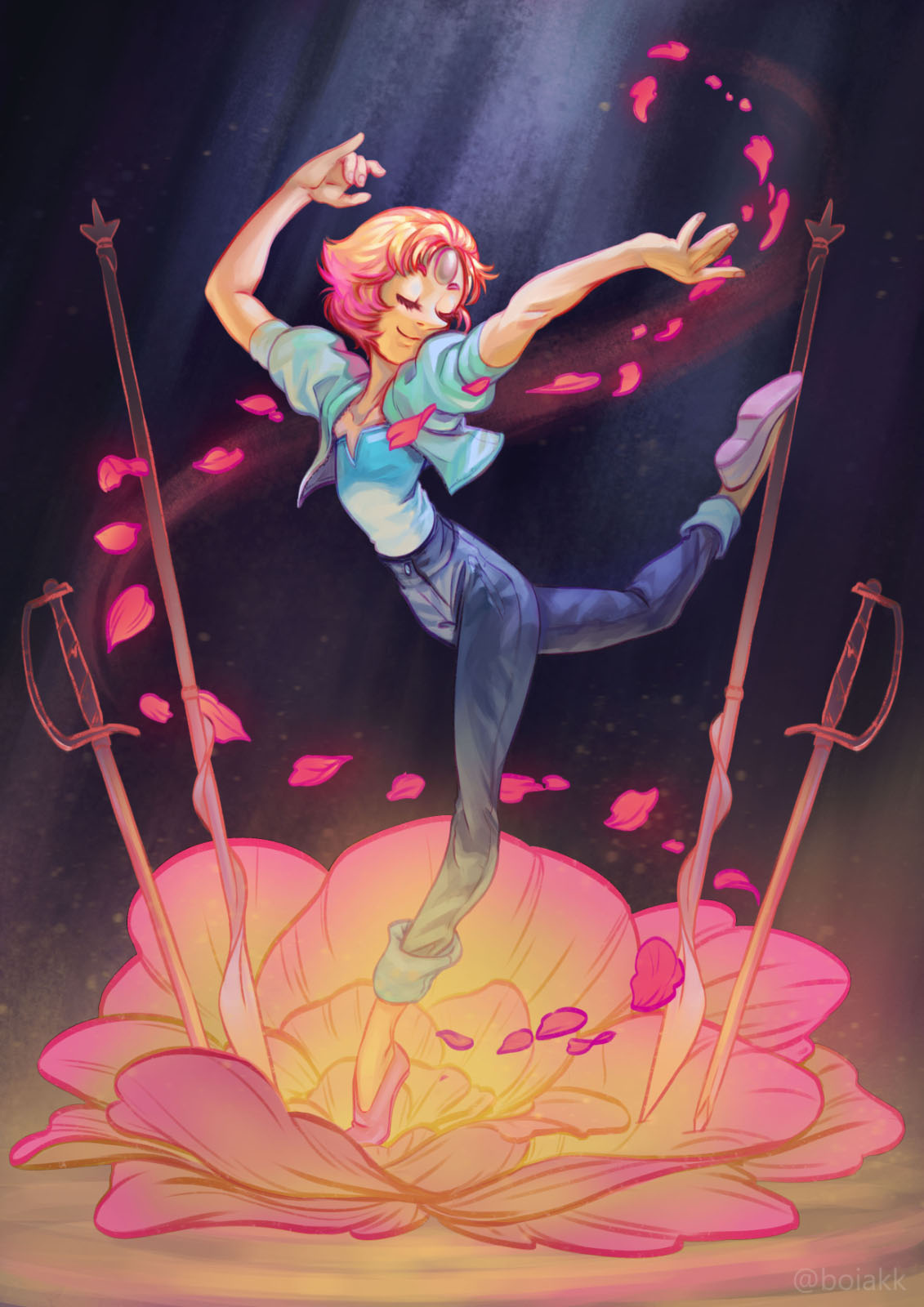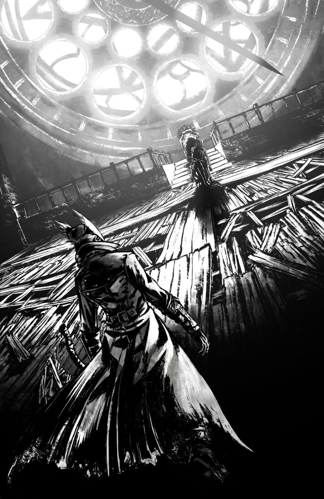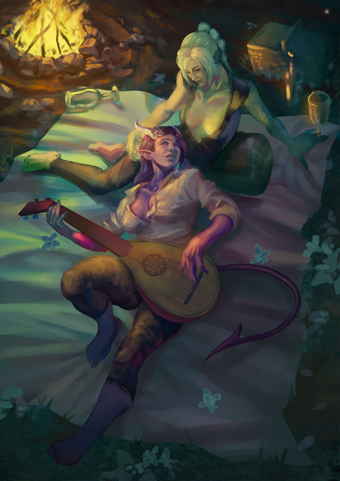 Ollie is a fame-seeking bard, one very eccentric at that! As tense as the moment was, we wanted something glorious and flamboyant, so it was an easy decision going for a movie poster(ish) composition, with his back turned to us, posing and playing his guitar like nothing else matters in the world. It's his moment on the spotlight. This illustration precedes chronologically the dinner picture and it's the reason such commemoration was thrown in their honor on the first place!