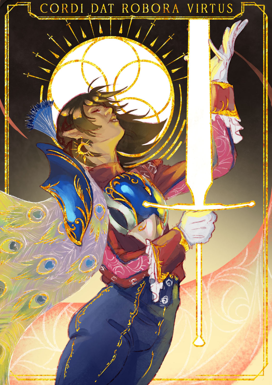 She was now a cleric, so I was asked to both represent this in its appearance, create the symbol for her god based on an eye shape and roses, but yet feel somewhat mobile and flowing; she was still a bard after all. And lastly but not least, her dragon-slaying rapier needed to be designed.