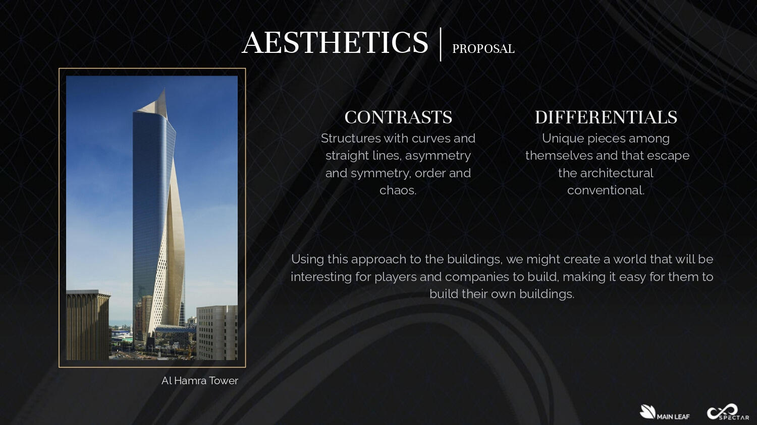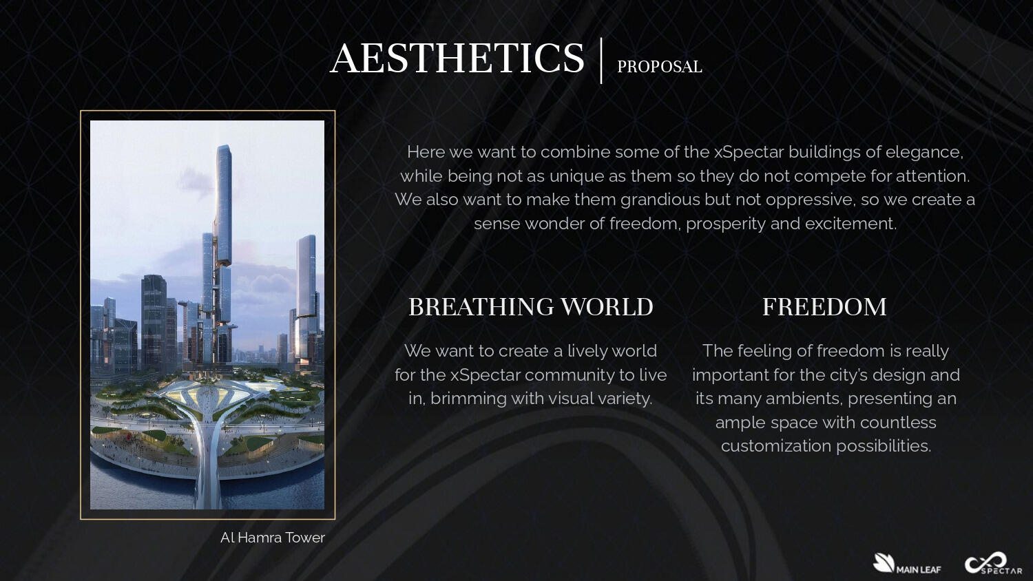 This project hosts a futuristic metaverse, with realistic graphics and a slight influence of solar punk, creating a mixture between modern and natural sceneries.Players would be able to purchase plots as NFTs and build in those lands. Recreation, business utility; you name it. xSpectar aimed to create a hub for them all, serving as an expression venue for those purchasing, and social gathering for everyone willing to participate.