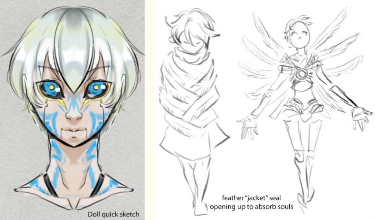 If Dolls were created from Aberrant's purified material, they could share similarities, like patterns, but reversing colors.Another idea, If Aberrants were angel-like creatures, let's turn what looks like to be a tech-wear straight-jacket into folded wings, reflecting the tight control the church tries to keep on the Dolls.This could be reflected in the Holy City's architecture, creating angelical motifs. If they had gigantic towers reaching for the sky to represent their holiness, imagine if they were adorned with wing-like ornaments surrounding them, becoming extremely thematic and potentially awe striking, showing again how helpful assimilating the lore into the visual development can be.