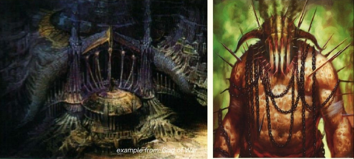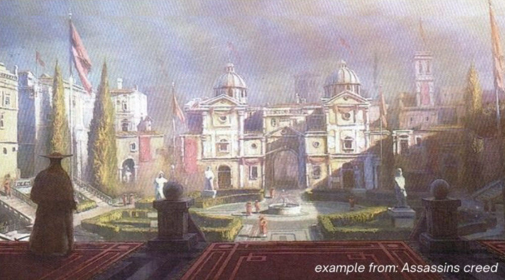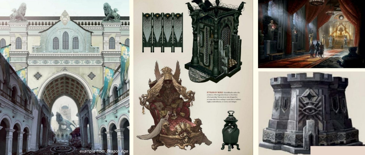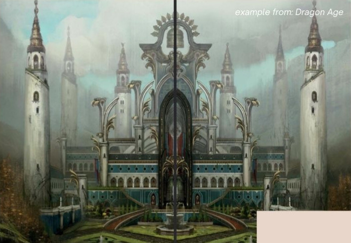 On the right we can see Hades' palace, which is shaped after his helmet. It creates an incredibly unique architecture, while also contextualizing us about its function.God of War context can be exaggerated compared to Ever After, but as far as examples goes, it embodies perfectly this concept.Dragon Age is another incredible inspiration, showing how symbology can stem not only from obvious motifs like statues, but subtler ones such as architectural aesthetics.