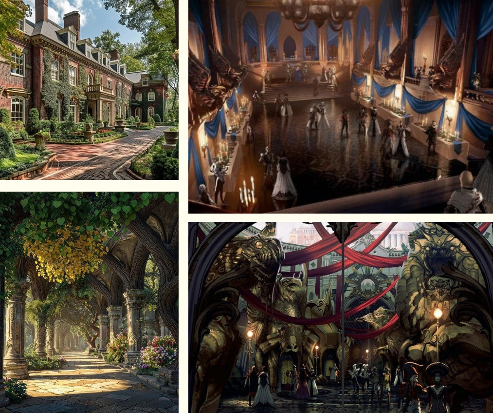 Militaristic. This is first term that comes to mind, since: the royal family is from a line of warriors, they are the “strongest nation” within a tense political setting, and have a Queen described as pragmatic, prioritizing their nation above all else. I would bet its surroundings would be the safest place to be, but also the most rigorous.Some degree of opulence and prosperity would likely be on display, reflecting their success, but in moderation due to the Queen's pragmatism.The current design has a lot of straight lines, which helps to imply order and strength. However, I still miss a more "grandiose" and "controlled" felling, as the current version can feel claustrophobic and confuse due to how elements overlap.I would open up this square, add soldiers around and limit access points, creating a beautiful but tightly controlled place, similar to the references on the left. This way, Kladius would reflect its role in this world.