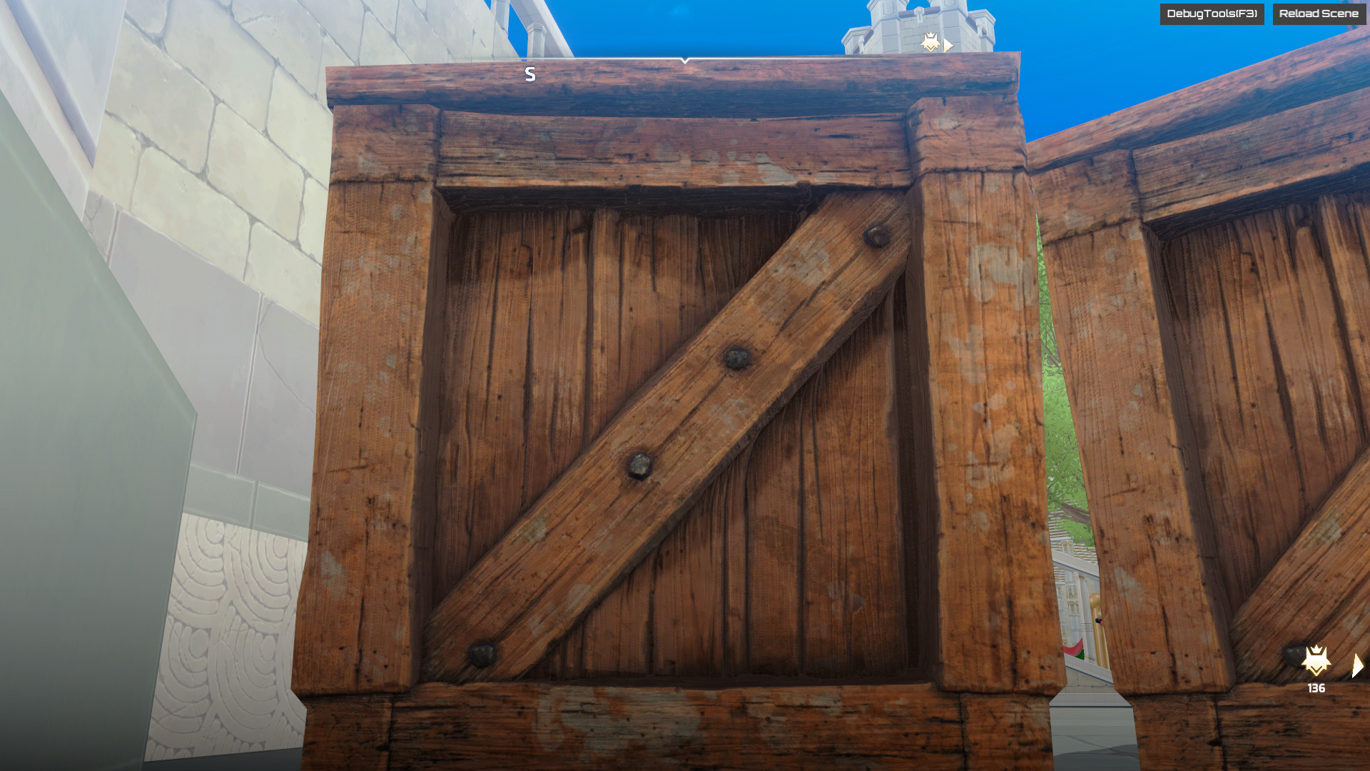 Speaking of models, a target level of detail/resolution for the textures should be set. As far as I can tell, this project is aiming at a clean-ish cell-shaded style. However, we can find textures varying widely in texel density.An example is these wooden box, which has finer details than most of the map put together.In the bottom image, notice how out of place the boxes look like within an otherwise clean and simple texturized environment.