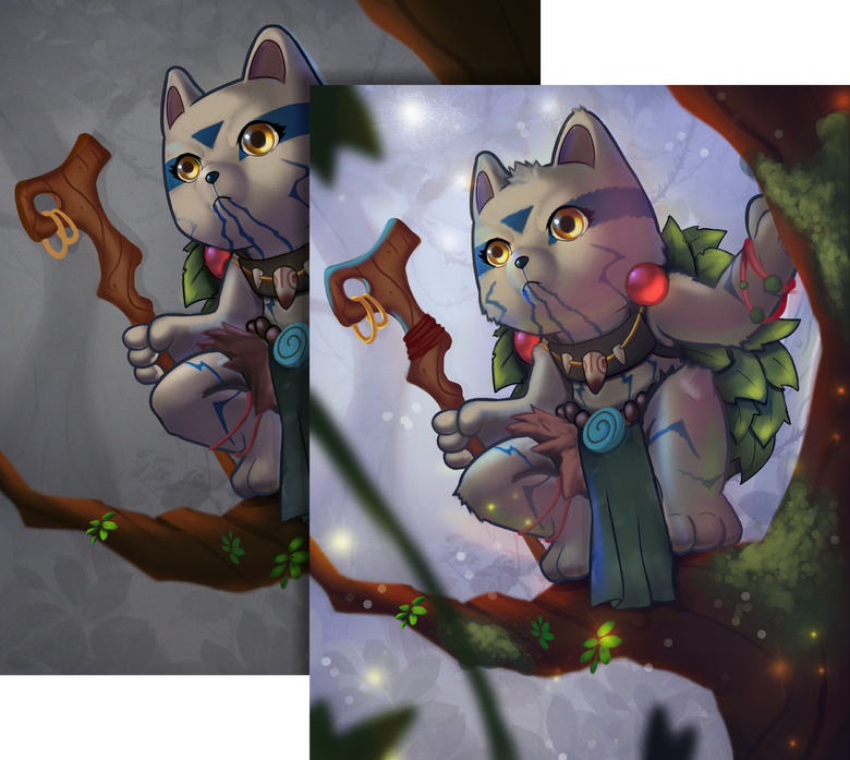 The main course of the meal, the group shot! Even though it had the most straight forward briefing, it was by far the hardest execution. The group should be together feasting, in what might look like a family's party photo. The catch though was how big and detailed this picture needed to be, with each character being as big (if not bigger) than what I usually did for full-body character drawings. Challenging, but very fun to make them interacting like this bringing forth a bit of their personalities.