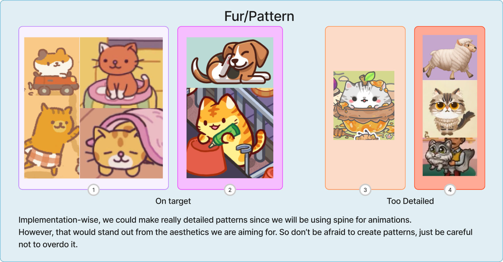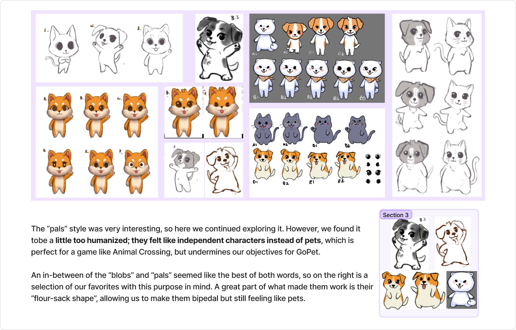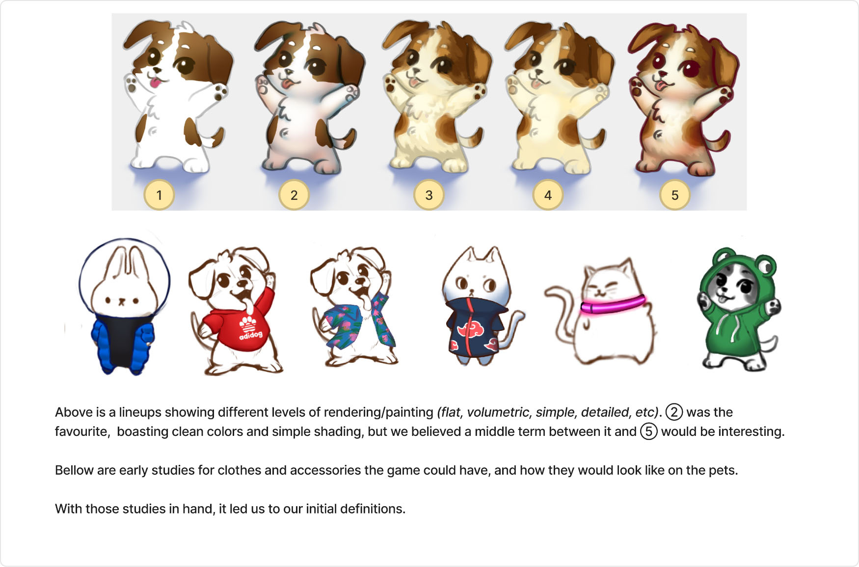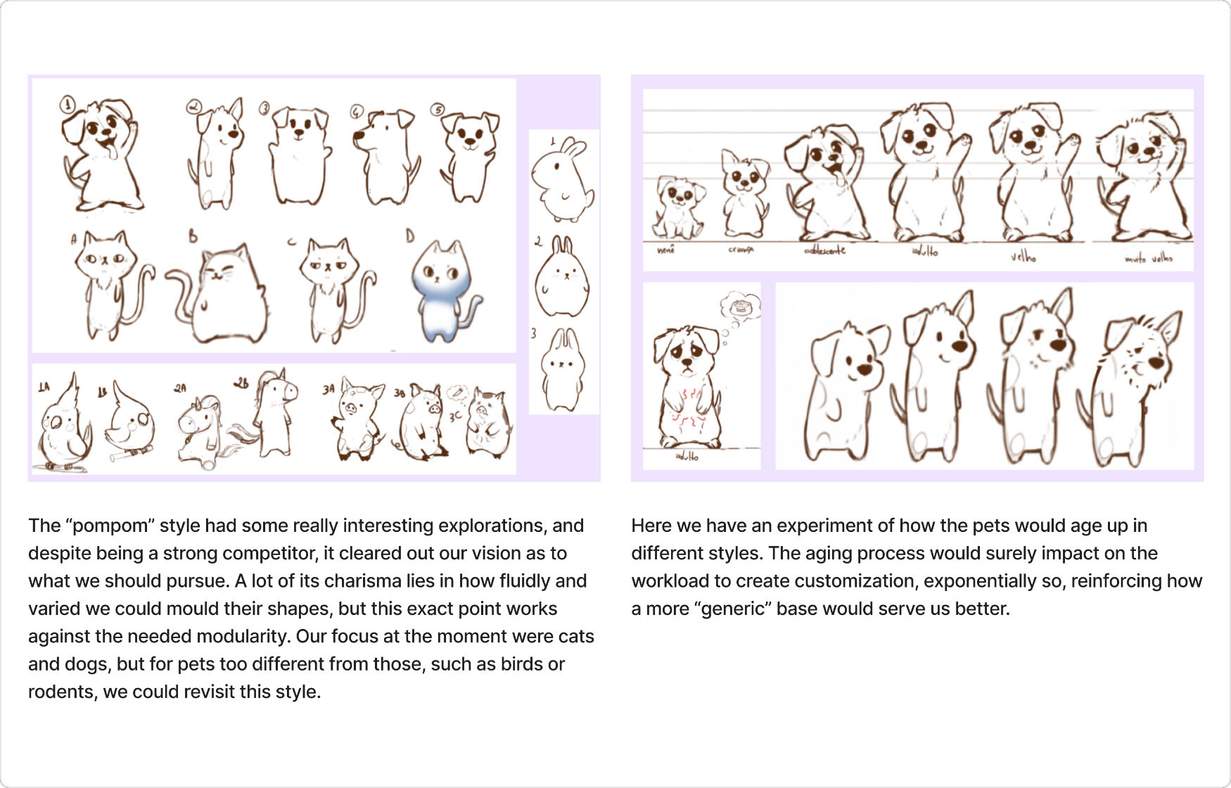 We knew from the start that we would be using Spine to reutilize the skeletal animation as much as possible, so even on early explorations we focused on creating easily-customizable and/or swappable animals.Below is the created explorations based on the exploration paths shown above: