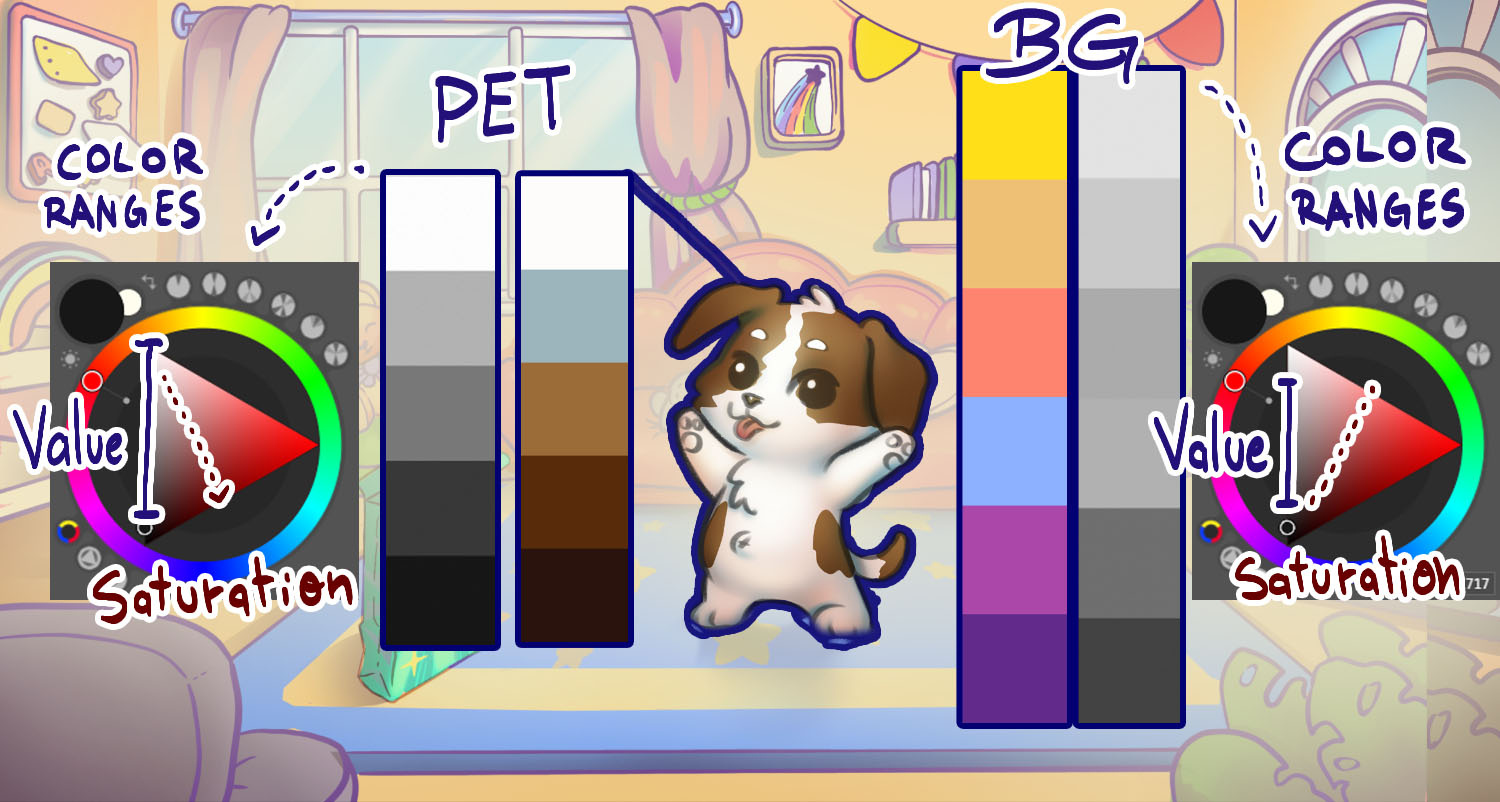 Meanwhile, the BG pallette is the opposite; a smaller value range to create a readable hierarchy between elements, while having its lighter colors more saturated and shadows desaturated.This allows us to have a vibrant game, while trying to avoid extremes.